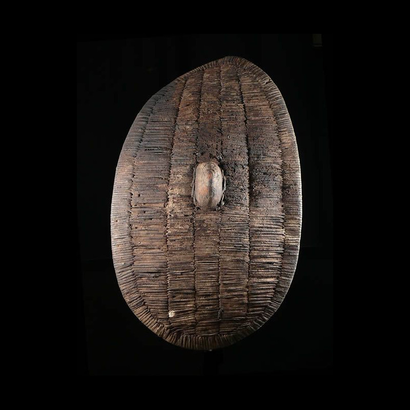 L'umbo central est en bois massif, le reste est en fibre ou écorce végétale tressée, une particularité qui rend très difficile le fait d'en trouver en bon état.