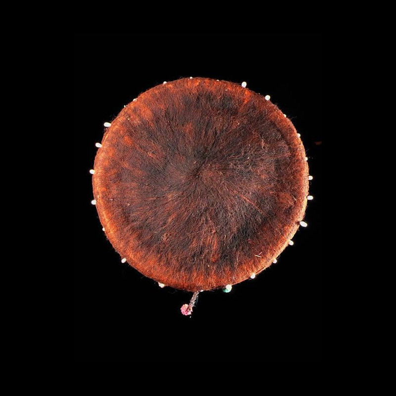 Voici un chapeau circulaire ancien, de la région du Pomeroy, au centre du pays Zoulou, fabriqué en cheveux et laine, teint à l'ocre rouge mélangé à de la graisse.