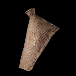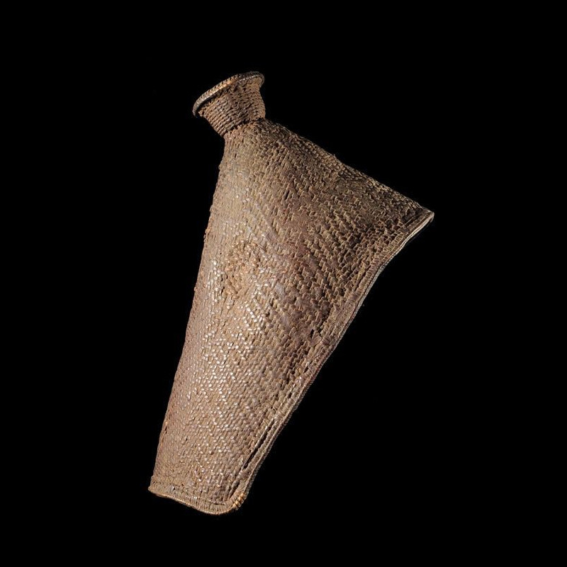 Ce capuchon en fibres végétales tressées est destiné à protéger les bébés Mangbetu de la pluie lorsqu'ils sont sur le dos de leur mère.