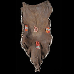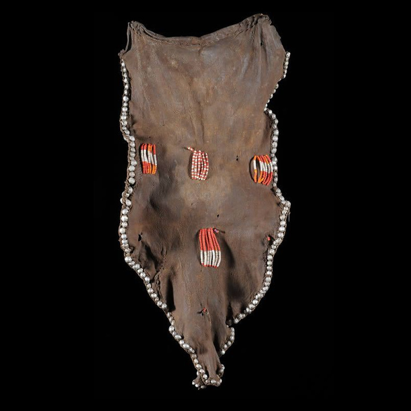 La partie en peau (d'antilope ?) est bordée de perles lourdes en métal, que les Hamar nomment Suna.