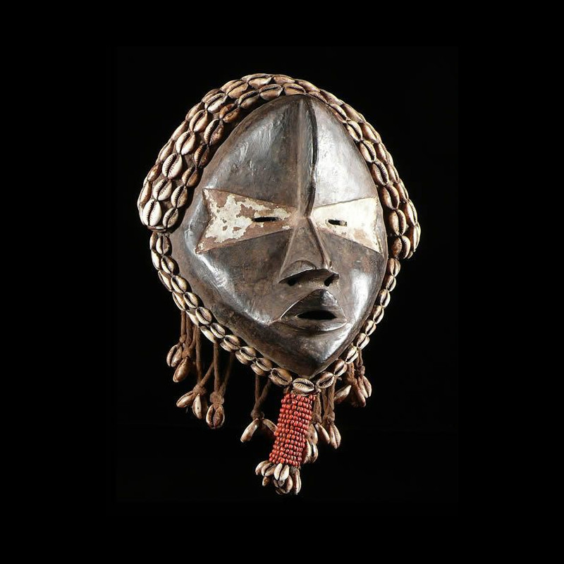 Beau masque de réjouissance, bois dur, cauris, perles et kaolin. Très belle pièce.