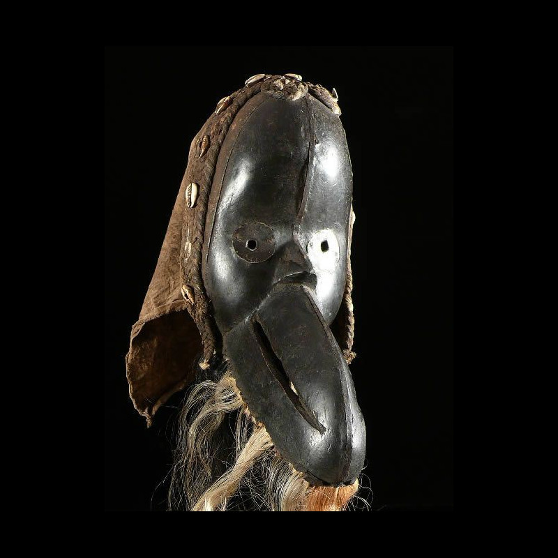 Masque dit Gagon, à bec, crin, fibres, tissus, cauris et metal sur le pourtout des yeux. Bois dur. Les masques Dan "Gagon" se situe dans le nord du pays.