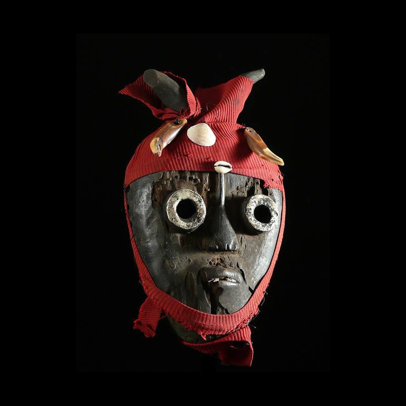 Original Dan en provenance du Libéria. Ancien mais abandonné et reconditionné. Manques sur la face, cernes de yeux et dents en aluminium, tissu rouge.