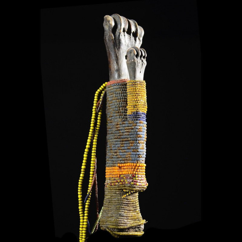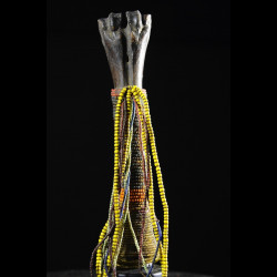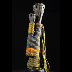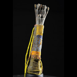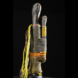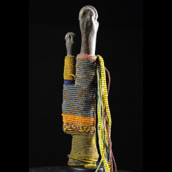 Belle poupée en os de suidé richement orné de perlages. Cette pièce a la particularité de "porter" un enfant.