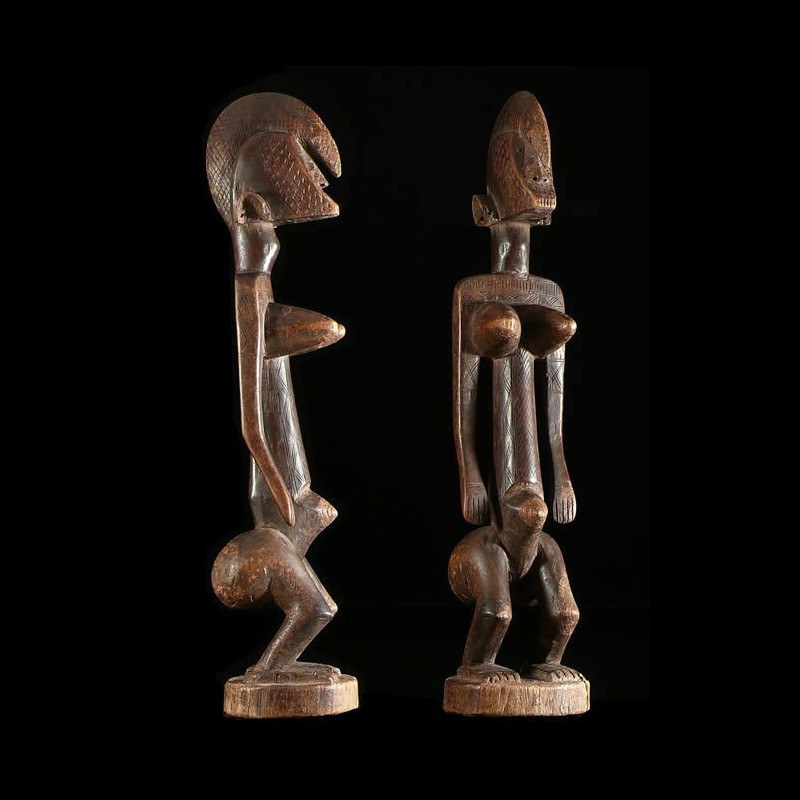 Belle grande statuette, patine couleur cuir, quelques manques, superbe plastique, collectée à Bougouni.